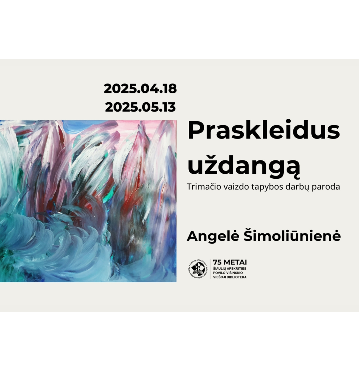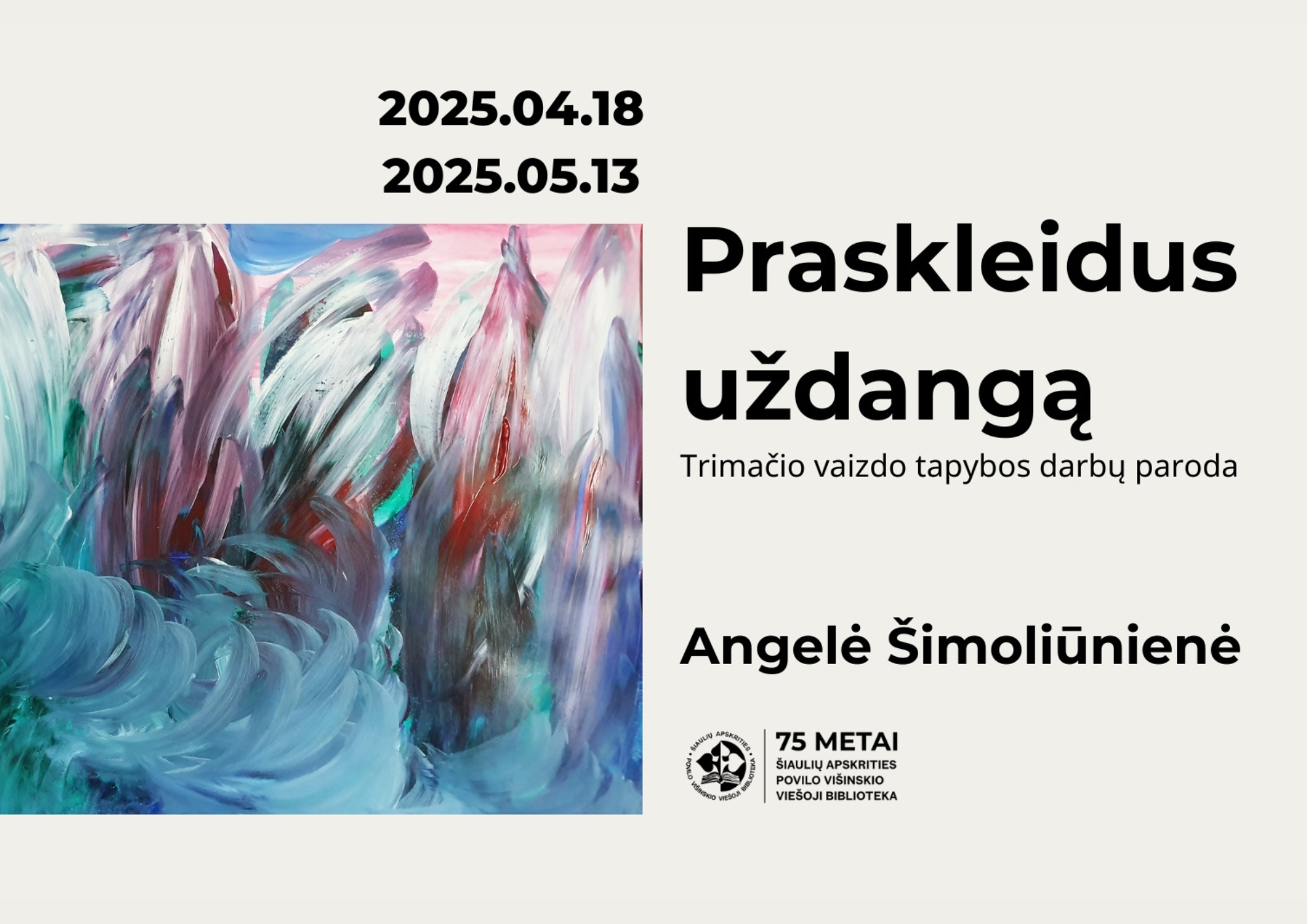 Balandžio 18 d., penktadienį, 17 val. III a. galerijoje atidaroma menininkės Angelės Šimoliūnienės trimačio vaizdo tapybos darbų paroda „Praskleidus uždangą“.