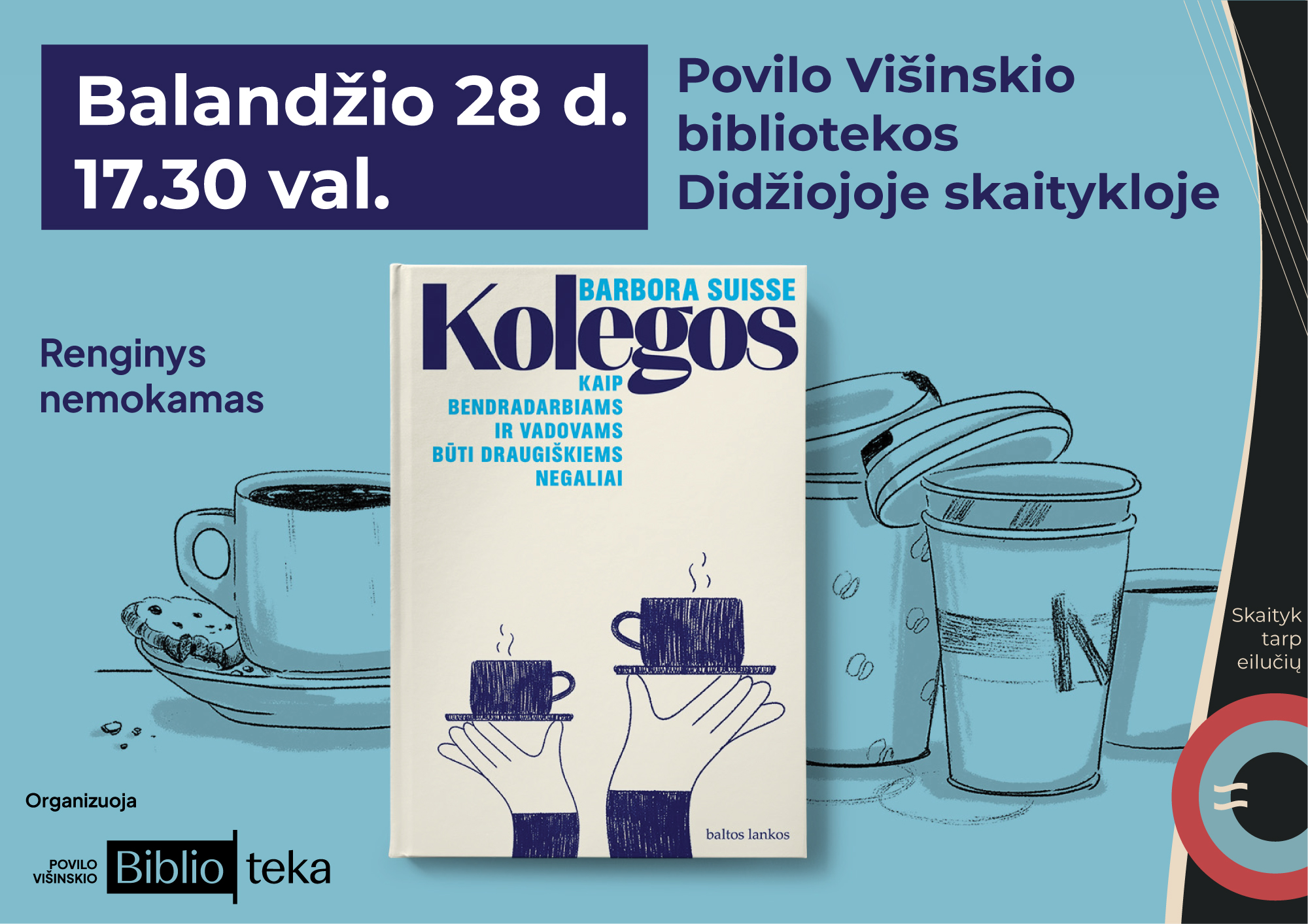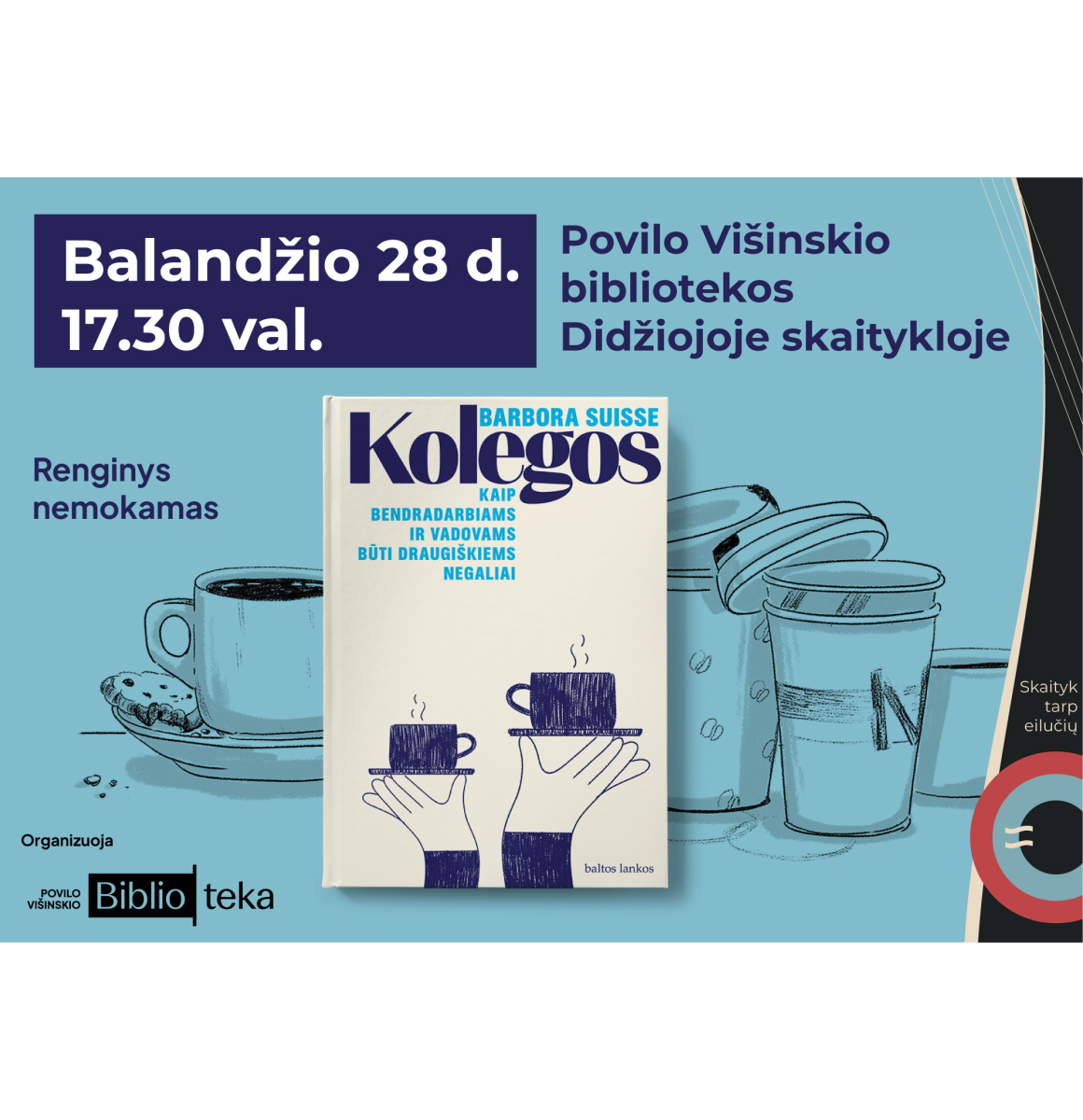 Balandžio 28 d., antradienį, 17.30 val. bibliotekos Didžiojoje skaitykloje bus pristatoma Barboros Suisse knyga „Kolegos. Kaip bendradarbiams ir vadovams būti draugiškiems negaliai“.
