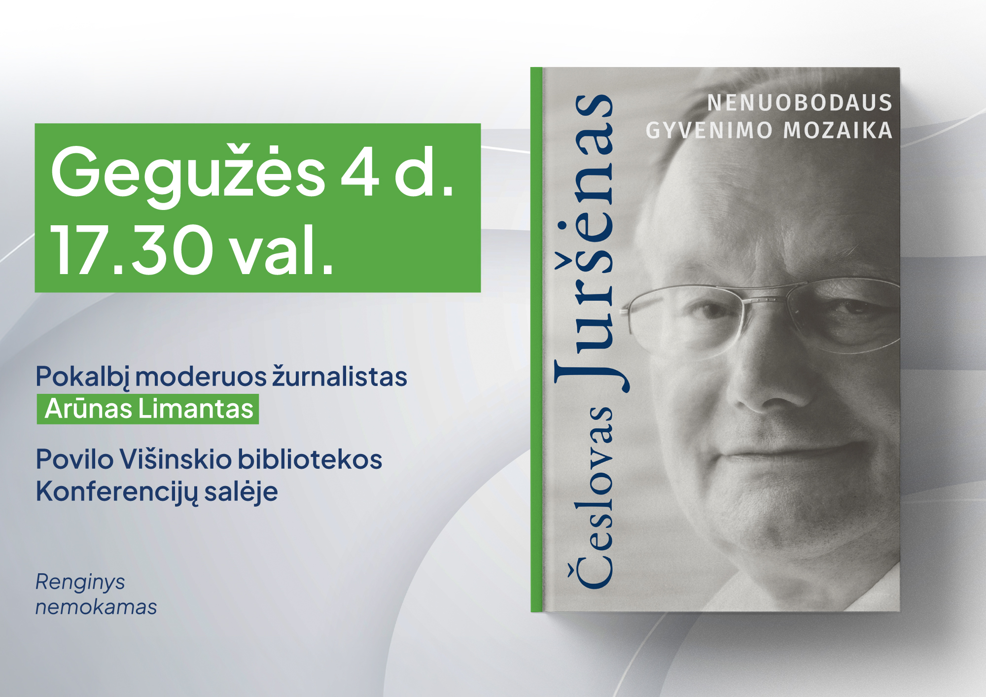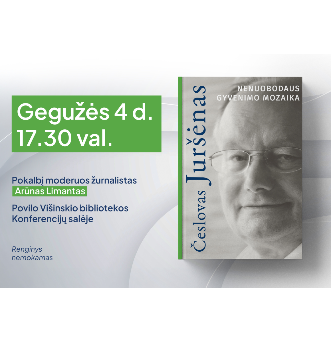 Gegužės 4 d., pirmadienį, 17.30 val. kviečiame į susitikimą su žurnalistu, Nepriklausomybės Akto signataru, buvusiu LR Seimo pirmininku Česlovu Juršėnu. Renginio metu bus pristatyta jo prisiminimų knyga „Nenuobodaus gyvenimo mozaika“ – atviras, gyvas pasakojimas apie politikos užkulisius, istorinius lūžius ir asmenines patirtis.