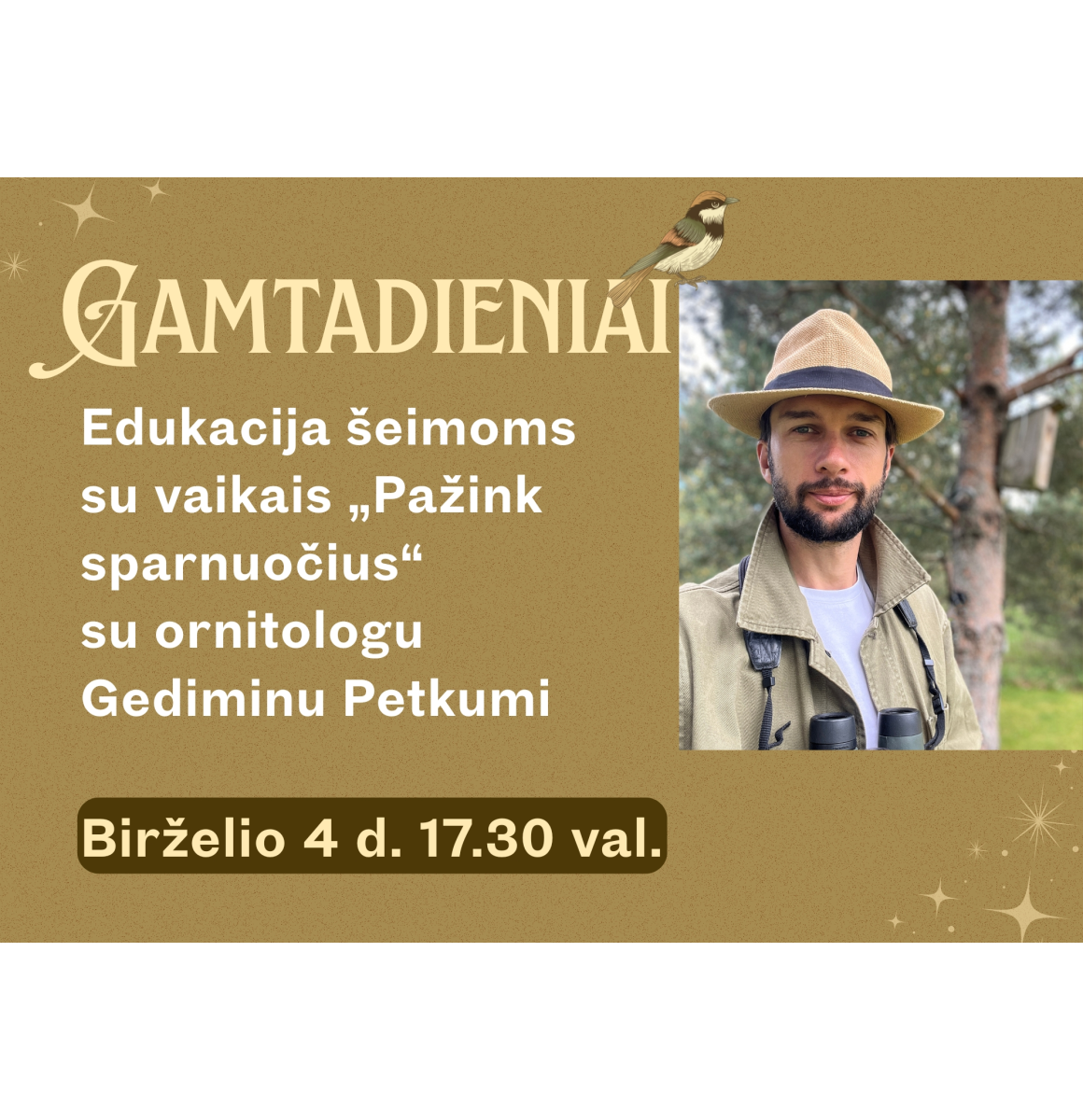 Gediminas Petkus, ornitologas, edukatorius, dalinsis įžvalgomis apie paukščius ne tik iš mokslinės, bet ir iš kultūrinės pusės: kaip paukščiai atsispindi tautosakoje, simbolikoje bei kasdieniuose gamtos stebėjimuose. Ornitologas papasakos, kokie paukščiai gyvena šalia mūsų, kuo jie maitinasi, kaip suka lizdus ir daug kitų įdomių dalykų.