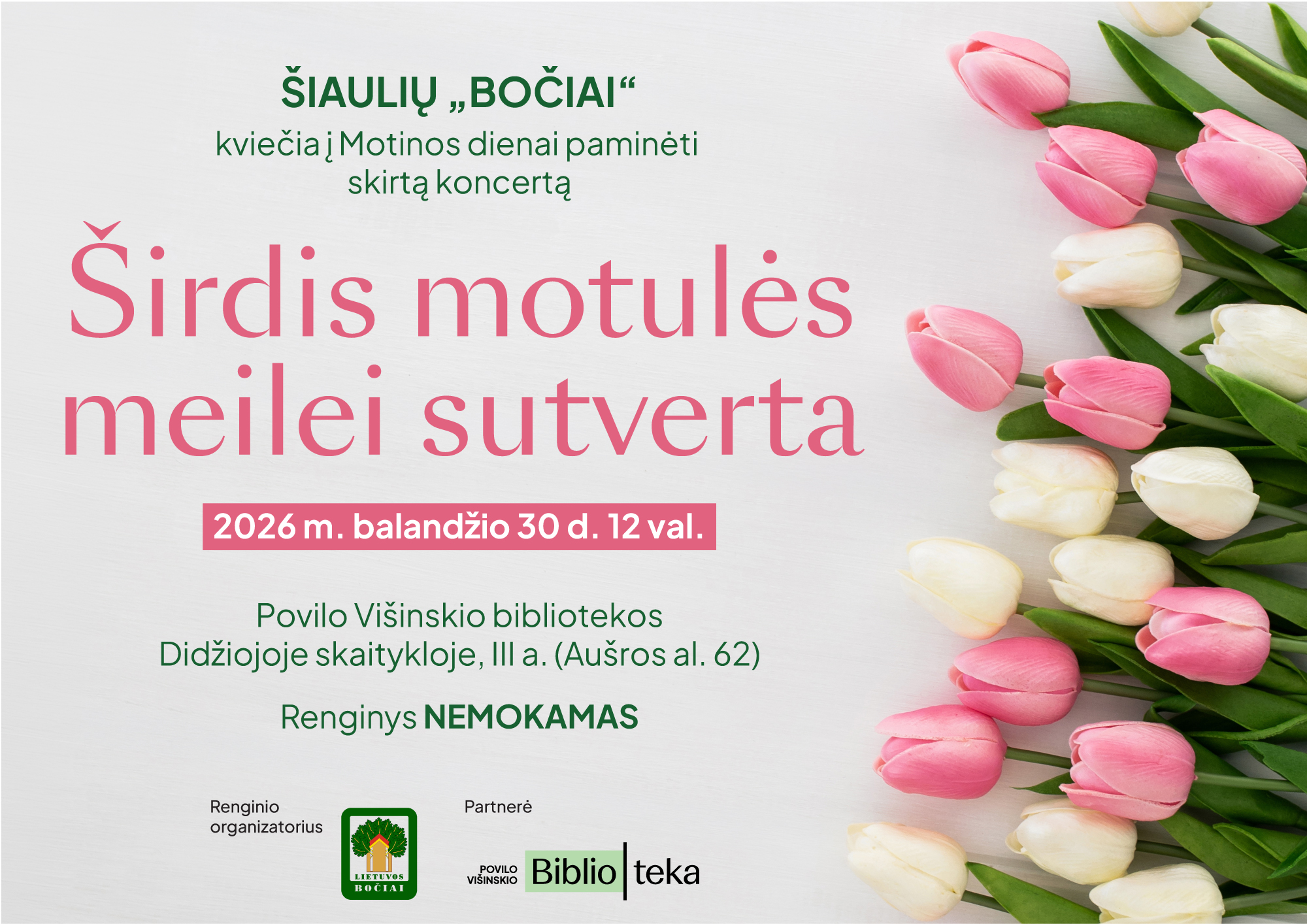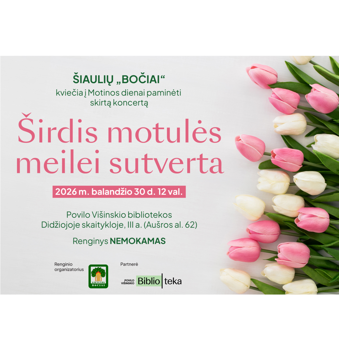 Balandžio 30 d., ketvirtadienį, 12 val. Šiaulių „Bočiai“ kviečia šiauliečius į Motinos dienai paminėti skirtą koncertą „Širdis motulės meilei sutverta“.