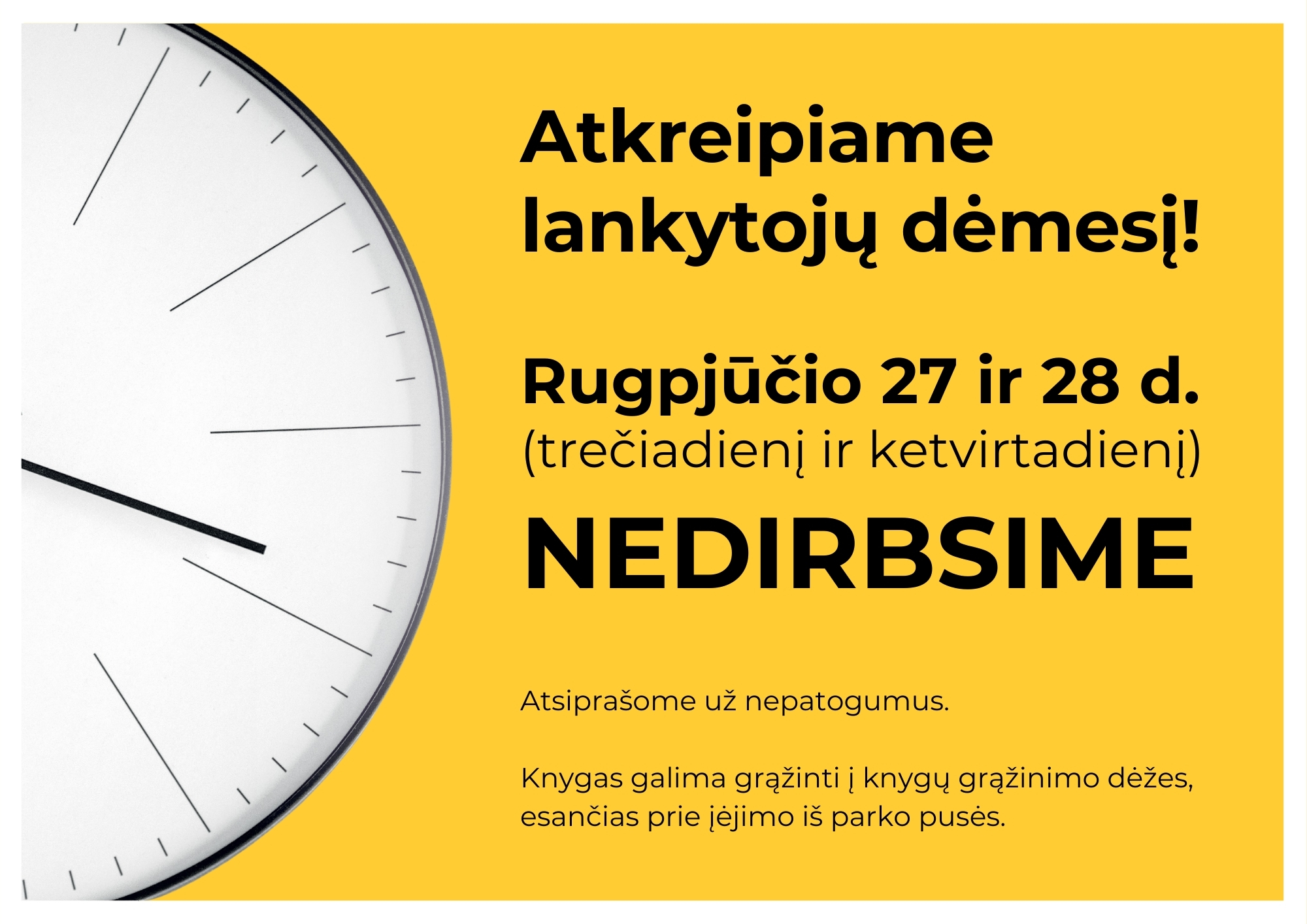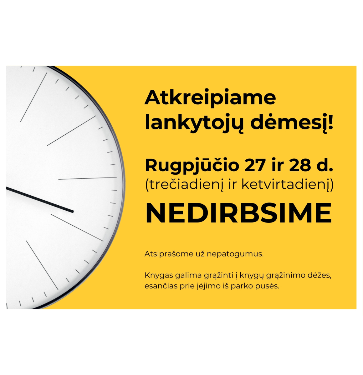 Rugpjūčio 27 ir 28 d. (trečiadienį ir ketvirtadienį), dėl vykdomų remonto darbų, biblioteka NEDIRBS. Lankytojų neaptarnausime.