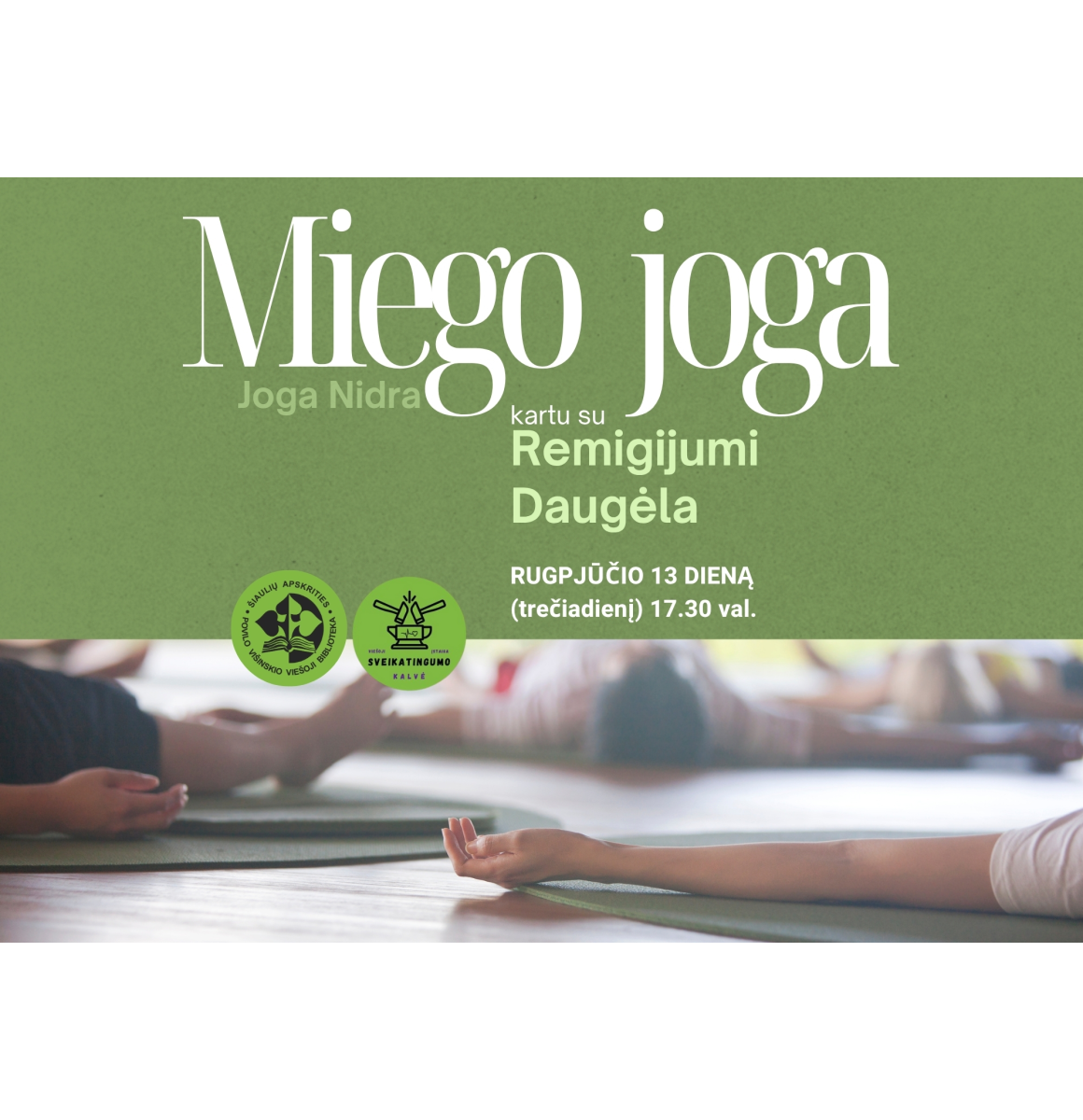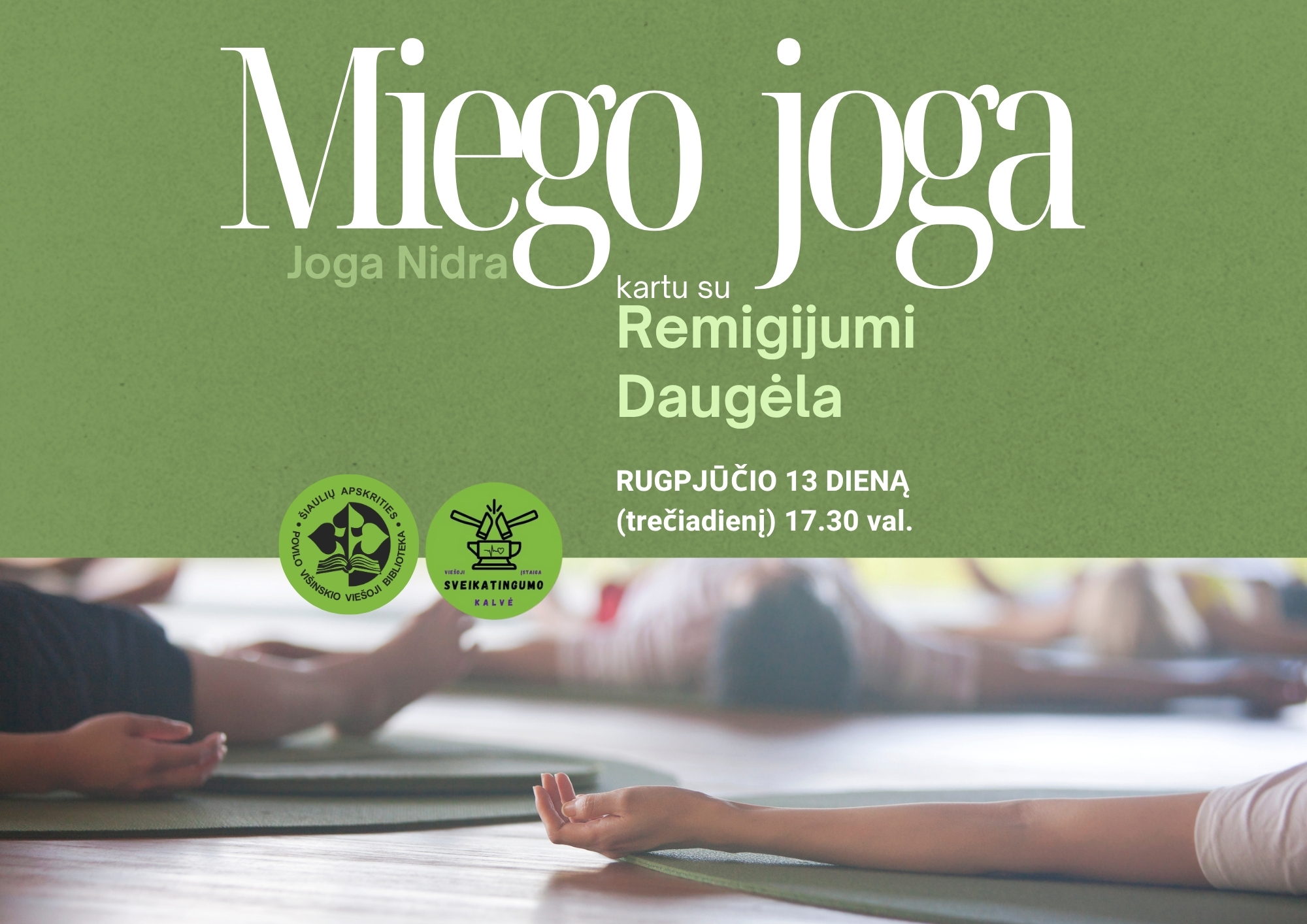 Rugpjūčio 13 d., trečiadienį, 17.30 val. Šiaulių apskrities Povilo Višinskio viešosios bibliotekos Didžiojoje skaitykloje (III a.) vyks miego jogos užsiėmimas su fizinio aktyvumo specialistu Remigijumi Daugėla.